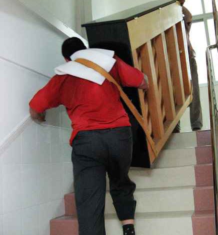 4、如果鋼琴要搬上樓,最好也要有四至五個(gè)人。首先要保證搬琴人的安全,同時(shí)鋼琴不能碰撞、劃蹭,外表的保護(hù)重于內(nèi)部。鋼琴的背面朝墻壁,鍵盤朝樓梯的扶手。兩人在下,三人在上,最好用寬布帶挎在肩上兜住鋼琴的車腳。同時(shí)用手抓住琴背的把手和鍵盤底下(不能拉鋼琴的腿),抬起鋼琴一鼓作氣搬上一層樓再休息。特別要注意的是,鍵盤的一側(cè)不能碰扶手,車腳不能碰樓梯。到一層樓面拐彎時(shí)要當(dāng)心碰撞、調(diào)整好方向然后再抬起往上搬。進(jìn)房門時(shí),也要當(dāng)心蹭著門框,保證最后安全地把鋼琴放到安排好的位置上。